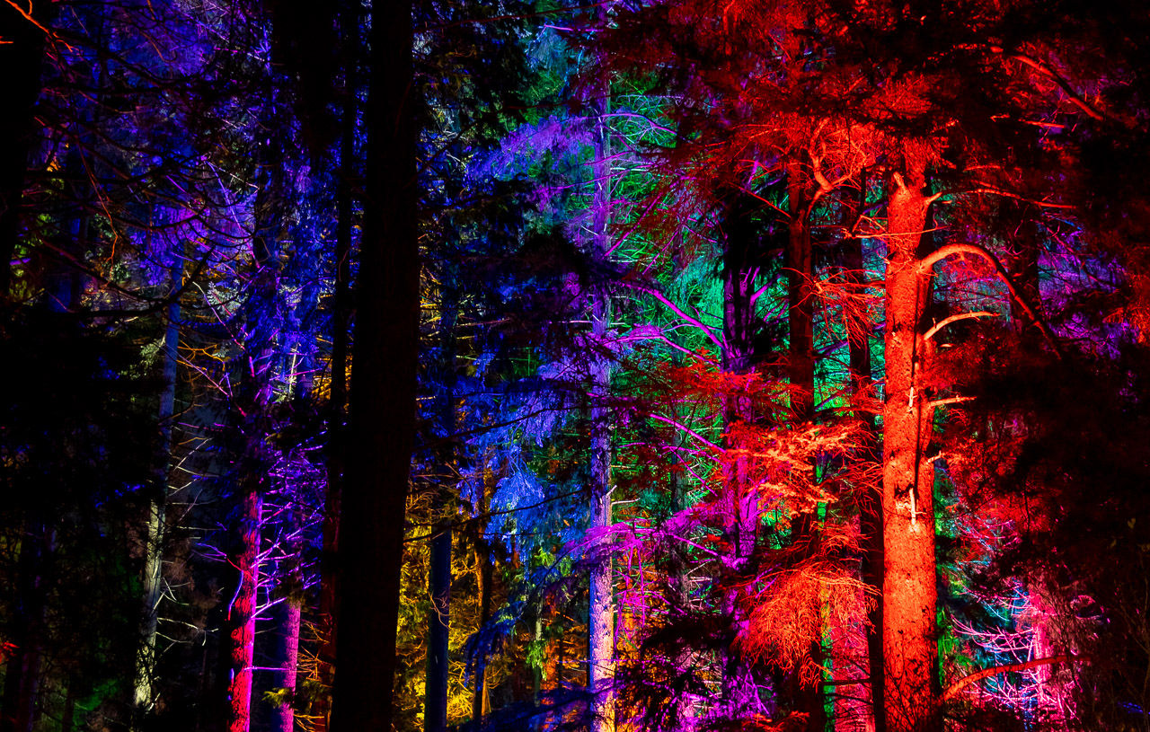 A vibrant mass of coloured trees sway in time to the changing coloured lights and festive music.