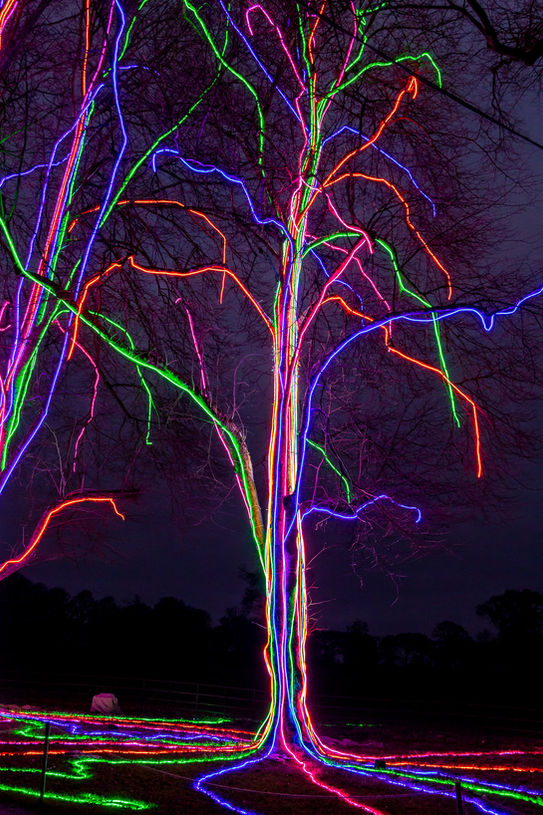 The leafless branches and trunk of the tree are lit with strips of neon in multi colours. From the base of the tree to the farthest tip outlining its stark magnificence in winter.